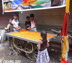 Mais c’est une fête à l’image de ce dieu : heureuse, sympathique et surtout communautaire. Chaque quartier hindou a son idole, chaque famille hindoue a la sienne : achetée en commun, elle est révérée, parée, décorée, on lui apporte des offrandes et tous l’emmènent en procession vers la mer où, au douzième jour, la statue est immergée (symboliquement parfois, j’en parlerai demain) pour que la fortune, aux deux sens du terme, rejaillisse sur la famille et la communauté.