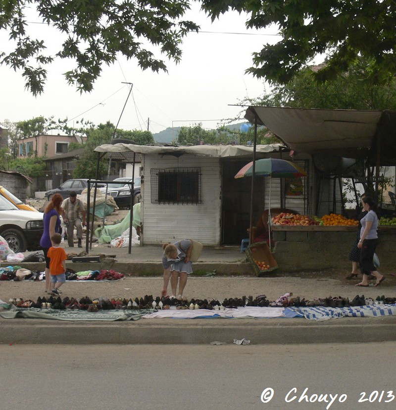Scènes de routes, de villes poussiéreuses qui s’éveillent. Les clichés commencent à prendre place dans le paysage mais aussi à s’entrechoquer avec la réalité. Infrastructures et habitat grossièrement laissés entre la construction et l’abandon, le béton à nu et les poutrelles métalliques au vent. Les jantes « neuves » s’alignent le long des routes, les troupeaux de mouton surplombent les autoroutes et tu commences à avoir une idée de toute la collection Mercedes depuis la nuit des temps. Le tabac est partout, roulé, cigaretté, les petits vendeurs proposent des fruits le long des routes et des kokochë dans les furgon.