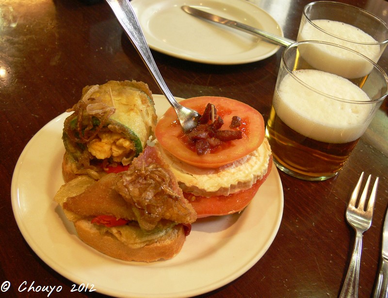 Après deux pintxos avalés, tu es bien calé. Le pain, les produits frais mais ibériques donc gras, tu te retrouves donc à voguer pleine comme une barrique sans être pour autant bourrée d’un bar à l’autre, en te demandant comment tu vas faire pour goûter tout ce que tu aimerais découvrir. Oui, mais dans le bar d’après il y a tel fromage piqué de légumes marinés et saupoudré de délicats et tout petits-mignons lardons frits. Et celui d’après, ce sont les poissons ! Et après… et après…